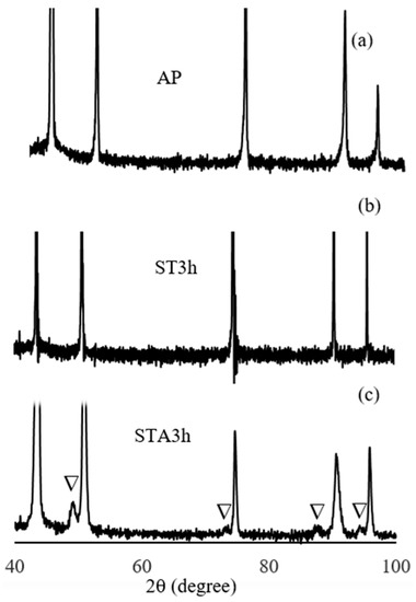 X-ray diffractograms of (a) AP, (b) ST3, and (c) STA3. The strong peaks are indexed to the fcc structure (γ), whereas the inverted triangles are pointing to the peaks indexed to the tetragonal structure (γ″ phase).