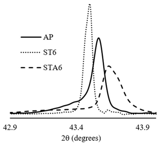 Additional information can be obtained by examining the position and width of the X-ray diffraction peaks. The hump/shoulder seen on the lower angle side of (111)γ of the AP peak, for example, could be due to Laves and/or carbide phases. The residual stresses in the lattice defects may also contribute to the hump. Apparently, these humps disappeared after the solid solution heat treatment as shown in Figure 10 (ST6 vs. AP). The peak of the solid solution heat-treated sample (ST6) became narrower compared to that of the AP, mainly due to relief of stresses following recrystallization. The shift of the STA6 peak to the high angle side relative to AP is also depicted in Figure 10. The shift is clearly due to the formation of the tiny strengthening precipitates (γ′ and γ″) that enhance the strain in the matrix. Furthermore, redistribution of the alloy composition due to dissolution of the segregated primary phases may also contribute to the shift of the peaks. In addition, the STA6 peak is broader than the AP as well as the ST6 peaks. Further broadening of the STA6 peak is believed to be due to the formation of the nano-sized precipitates (γ′ and γ″) after aging, which agrees with Scherrer’s equation, what shows the inverse relationship between X-ray peak broadening and crystal size.