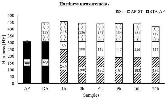 Average hardness (HV) of as-printed, direct-aged, ST and STA samples.