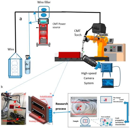 Cold metal transfer (CMT) processing experimental equipment and process. (a) CMT welding solidification crack test platform; (b) CMT welding processing; (c) research process.