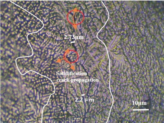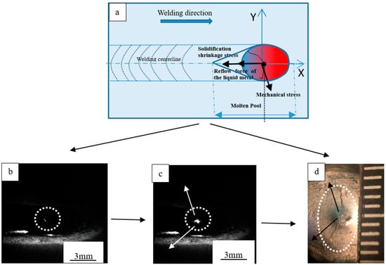 Figure 8 presents schematic diagrams showing the force analysis and the process of solidification crack formation through high-speed imaging when solidification cracks were propagated. It can be seen from Figure 8 that the molten pool is affected by three forces, namely the mechanical stress, reflow force of the liquid metal, and the solidification shrinkage stress. Through crack propagation, the influence of the WFS on solidification cracks was studied, and it was found to be related to joint quality. Experiments conducted on various WFSs confirmed that WFS will significantly affect the microstructure around the crack. Ploshikhin et al. proposed the displacement criterion to judge the propagation of solidification cracks: when the cumulative displacement of the tail of the molten pool exceeds the critical displacement of the propagating crack, the crack propagates forward [31].