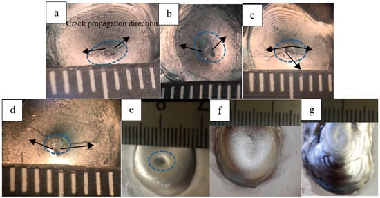 Effect of wire feeding speed on the solidification cracking of the aluminum alloy: (a) 4 m/min; (b) 4.5 m/min; (c) 5 m/min; (d) 5.5 m/min; (e) 6 m/min; (f) 6.5 m/min; (g) 7.0 mm/min.