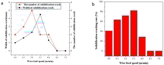 (a) Effect of wire feeding speed on the width and number of cracks; (b) effect of wire the feeding speed on the crack rate.