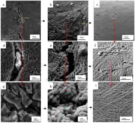 Influence of wire feeding speed on the microstructure near the solidification cracks: (a,d,g) 4.5 m/min; (b,e,h) 6 m/min; (c,f,i) 7 m/min.