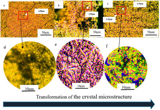 Transformation of the microstructure of crystals under different wire feeding speeds: (a,d) 5 m/min; (b,e) 5.5 m/min; (c,f) 6.5 m/min.