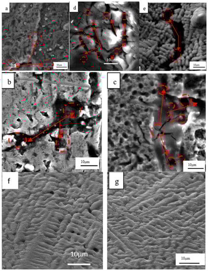 Figure 9 reveals the microstructure of the solidification crack when the crack propagates when the WFS increases from 4 m/min to 7.0 m/min, according to the crack propagation path, the red arrows represent the direction of the crack propagation. The effect of each WFS on the propagation of the solidification was analyzed. At this point, we regarded the crack that grew as a crack, selected a region randomly through SEM, and counted the number of crack propagations.