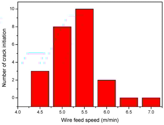 With the above analysis, the crack propagation was found to have a significant change as the WFS increased from 4 m/min to 7 m/min. The results in Figure 10 show that when the WFS increased from 4.5 m/min to 5.5 m/min, the crack propagation mechanism was unbalanced, and the propagation of crack was promoted, with a growth rate of 233%. When the WFS was further, the crack propagation mechanics model remained in balance, the crack generation was suppressed, and the cracking rate was significantly reduced.