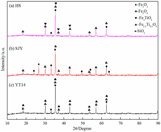 XRD (X’Pert Pro; PANalytical, Almelo, The Netherlands) was used to analyze the phase composition of the experimental raw materials, and the results are shown in Figure 1. Sea sand ore (HS) was mainly composed of hematite (Fe2O3), magnetite (Fe3O4), and ilmenite spinel (Fe2TiO4). Titanium was mainly present in sea sand ore in the form of ilmenite spinel. The main phases in Sijiaying (SJY) were hematite (Fe2O3), magnetite (Fe3O4), and silica (SiO2), while Yuantong-14 (YT-14) was mainly composed of the hematite (Fe2O3), magnetite (Fe3O4), and ilmenite oxide phases (Fe2.5Ti0.5O4).
