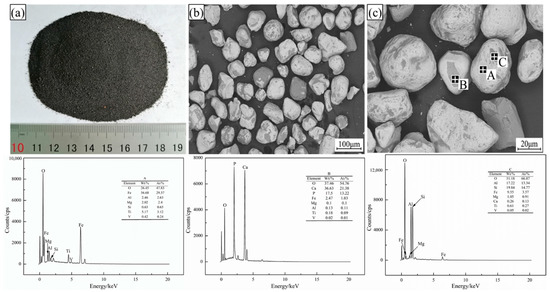 After putting the sea sand ore into an oven for drying treatment, its macroscopic morphology is shown in Figure 2a, and its microscopic morphology is shown in Figure 2b,c. An energy dispersive spectrometer (EDS) (Ultra Plus; Carl Zeiss GmbH, Jena, Germany) was used to analyze the chemical compositions. It can be seen from Figure 2 that the shape of the sea sand ore particles was relatively regular, showing a spherical or ellipsoidal shape; the texture of the particles was smooth and shiny; and the density was relatively high. These characteristics are not conducive to the preparation of oxidized pellets from the sea sand ore. The EDS analysis results were consistent with the XRD analysis. In addition, it was found that P in the sea sand ore existed in the form of calcium phosphate (Ca3(PO4)2).