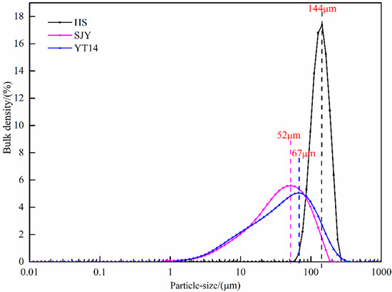 A Mastersizer 3000 laser particle size analyzer (Mastersizer 3000; Malvern, UK) was used to analyze the particle size composition of the three raw materials, and the results are shown in Figure 3. It can be seen from the particle size distribution diagram that the particle size of the sea sand ore was coarsest, followed by Yuantong-14, and Sijiaying ore was the finest. Among them, the particle size distribution of the large part of the sea sand ore was about 144 μm, and the particle size of Sijiaying and Yuantong-14 was relatively fine, most of which were distributed around 52 μm and 67 μm, respectively.