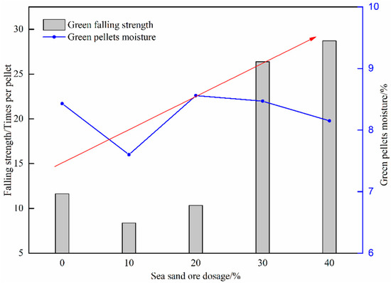 Falling strength and moisture of green pellets with different dosages of sea sand ore.
