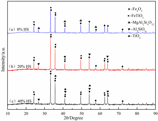 XRD was used to analyze the oxidized pellets with 0%, 20%, and 40% sea sand ore added, and the results are shown in Figure 8. The oxidized pellets were mainly composed of hematite, ilmenite, silicate, and titanium dioxide. Among the three types of oxidized pellets, Fe was mainly present in Fe2O3 and FeTiO3, and Ti was mainly present in FeTiO3. When sea sand ore increased to 40%, TiO2 was formed. In addition, the silicate phase was mainly MgAl2Si4O12 in oxidized pellets without sea sand ore; with increasing sea sand ore dosage, the silicate phase changed to Al2SiO5.