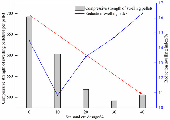 - As the amount of sea sand ore used increased, the reduction swelling index of pellets gradually increased, while the compressive strength of the pellets after reduction swelling showed a trend of gradual decline. When the amount of sea sand ore used was 40%, the reduction swelling index of pellets was 16.31%, which can still be used as the raw materials for blast furnace ironmaking.