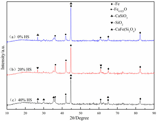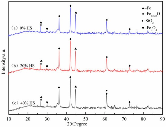Figure 13 shows the XRD pattern of the sea sand ore oxidized pellets after reduction swelling. With increasing sea sand ore dosage, the porosity between the particles inside the pellets increased, and the gas diffusion rate was fast during the reduction process, which resulted in the accelerated phase transition speed of Fe2O3–Fe3O4, and the crystal bridge between the hematite grains was quickly destroyed. In addition, with increasing sea sand ore dosage, the silicon content increased, which led to the reduction of part hematite into Fe and FexO. However, in the process of reducing wuestite to metallic iron, the catalytic action of alkali metals promoted the growth of metallic iron in a certain direction and produced iron whiskers, which made the volume of the pellets expand, and the reduction swelling index increased. In addition, severe pulverization happened after reduction swelling, and it is difficult to ensure the crystalline strength between the pellet particles simply by relying on the iron oxide recrystallization connection. Therefore, the compressive strength of the pellets after reduction swelling decreased.