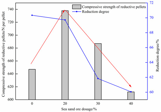 Effect of the sea sand ore dosage on the reduction degree of the oxidized pellets and the compressive strength of the reductive pellets.