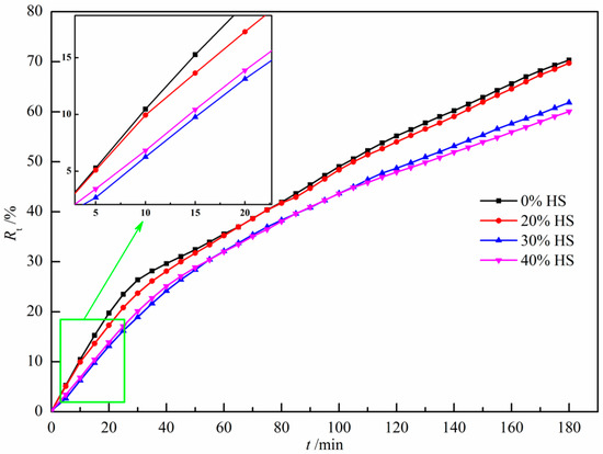 The influence of sea sand ore dosage on the reduction degree of oxidized pellets and the compressive strength of pellets after reduction is shown in Figure 14. Combining the analysis of the change curve of the reduction degree with the extension of reduction time in Figure 15. It was found that the reduction degree of pellets decreased with increasing sea sand ore dosage. When the amount of sea sand ore used was 40%, the reduction degree of sea sand ore pellets was only 60.06%, and the compressive strength of reduced pellets was 612 N/pellet. In addition, as the amount of sea sand ore used increased, the reduction rate of the pellets gradually decreased, and the reduction time to a certain reduction degree was gradually prolonged. The main reason was that the sea sand ore was a vanadia–titania ore, and the pellets contained valuable elements such as Ti and V, which are difficult to reduce and resulted in a decrease in the reduction rate and a reduction in the reduction degree.