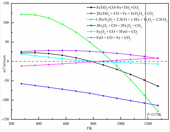With increasing sea sand ore dosage, the FeTiO3 content in oxidized pellets increased, and the reduction of FeTiO3 was mainly according to Formulas (4)–(6). It can be observed from Figure 17 that when the reduction temperature was 1173 K, the occurrence of Reaction (5) was still difficult. Therefore, the reduction product of FeTiO3 was metallic iron, but not FeTi2O5. The reduction of hematite was mainly the process of reducing hematite to magnetite in accordance with Formula (7), reducing magnetite to ferrous oxide with Formula (8), and reducing the ferrous oxide to metallic iron with Formula (9). Therefore, with the increase in sea sand ore used, the FeTiO3 content in oxidized pellets increased, but the reduction of FeTiO3 in oxidized pellets was limited, so the reduction degree of the pellets gradually decreased.