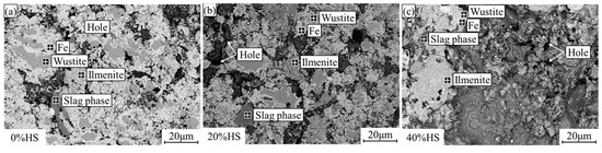 SEM diagrams of the oxidized pellets with the sea sand ore reduced at 900 °C for 3 h. (a) 0%HS; (b) 20%HS; (c) 40%HS.