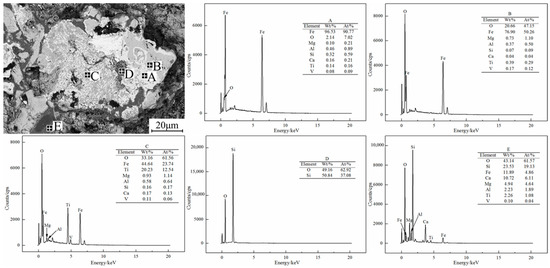 EDS and surface scanning were used to analyze the chemical composition of the internal mineral phases of the oxidized pellets with the additive amount of 40% sea sand ore, and the results are shown in Figure 10 and Figure 11. Combined with SEM-EDS and surface scanning analysis, it was found that the oxidized pellets of sea sand ore were mainly composed of hematite, ilmenite, silicate, silica, and calcium phosphate. The bright area A was mainly the hematite phase and a small amount of solid solution oxides such as Ti and V; the bright gray area B was the ilmenite phase containing a small amount of elements such as Mg and V; the dark gray area C mainly contained the silicate phase of Ca, Mg, Al, and a small amount of Fe, Ti, V; the black area D was oxides such as gangue SiO2; and the light gray area E was mainly slag phase materials such as calcium phosphate.