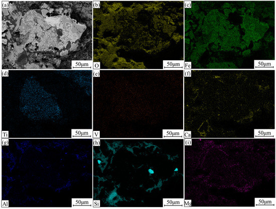 Elemental distributions of the oxidized pellets with 40% sea sand ore reduced at 900 °C for 3 h. (a) Electronic image; (b) O; (c) Fe; (d) Ti; (e) V; (f) Ca; (g) Al; (h) Si; (i) Mg.