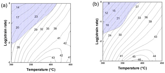 - According to the results of the processing maps, it is observed that, as the Mg content increases, the maximum power dissipation efficiency increases, whereas the plastic instability region area decreases. The level of power dissipation efficiency increases with the activation of dynamic restoration, especially dynamic recrystallization (DRX). It appears that the inhomogeneous deformation is suppressed by the acceleration of DRX in the Mg content under the dynamic restoration-activated conditions. Deformation band formation is evident in the region where the plastic instability occurs with a low power dissipation efficiency.