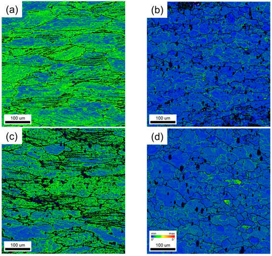 - The kernel average misorientation map visually indicates that the remaining local strain is much smaller in the maximum power dissipation condition than the low condition in both Al-6Mg and Al-8Mg alloys. The accumulated local strains during hot deformation of the maximum efficiency region appears to lead to the DRX formation.