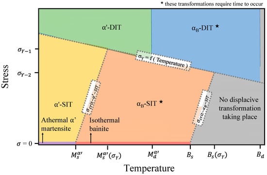 Figure 2. Schematic representation showing the stress–temperature conditions that must be met so that different types of transformations are thermodynamically possible. SIT and DIT stand for stress and strain induced transformation, respectively. Adapted from [64]. Units are arbitrary.