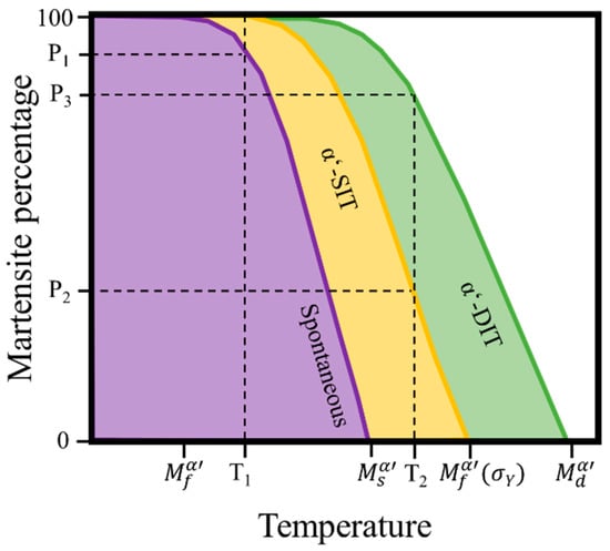 Again, it is considered that α′ and αB DIT can happen below the M s α ( σ Y ) and B s ( σ Y ) temperatures, respectively, as seen in Figure 2 because, even though the α′ and αB transformations are thermodynamically possible below those temperatures if plastic deformation is not applied, the application of plastic strain enables to further stimulate both transformations. Coming back to Figure 3 and assuming that austenite is cooled down to a temperature T2 in the range M s α - M s α ( σ Y ) , if neither stress nor strain are applied, the structure remains fully austenitic. However, if stress is increased up to σY, the α′ transformation is induced by stress until a fraction P2 is reached. If the stress is further increased, α′ is be strain-induced and the fraction could increase up to P3. Note that, in this case, P3 < 100%. Also, in the case of αB, it is possible that the modification of the thermodynamics due to the application of strain also modifies the kinetics, although only while the stress is applied. For instance, it has been previously reported that a αB DIT taking place while deforming a fully austenitized medium carbon steel at 520 °C and 400 °C got interrupted after the load was removed. Bainitic transformation did not start again until several tens of seconds later [35].