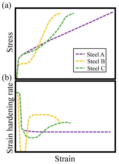 Figure 5. (a) Stress–strain curves and (b) strain hardening rate–strain curves corresponding to three different steels with a fully austenitic structure before the test starts and with the same austenite σ Y . Steel A is plastically deformed and no stress/strain induced transformation occurs and steels B and C undergo stress and strain transformations, respectively. Units are arbitrary.