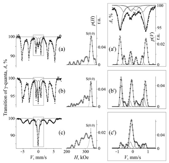 Mössbauer data of the MA samples after BM of Series A: (a–c) the Mössbauer spectra and distributions of the p(H) of the sextet for the α phase; (a’) the Mössbauer spectra and distribution of the p(V) of the center of the spectrum; (b’,c’) distributions of the p(V) of the center of the spectra. Treatment, composition: (a,a’) BM, composition 1 (Fe + 20% CrN); (b,b’) BM, composition 3 (Fe–6.7Mn + 20% CrN); (c,c’) BM, annealing at 800 °C, 1 h, composition 4 (Fe–8.9Mn + 20% CrN).