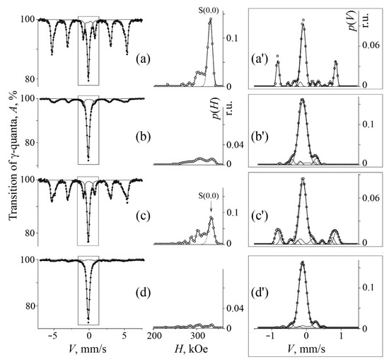 Mössbauer data of the MA samples after BM and annealing of Series B: (a–d) distributions of the p(H) of the sextet for the α phase; (a’–d’) distributions of the p(V) of the center of the spectra. Treatment, composition: (a,a’) BM, annealing at 700 °C, 1 h, composition 4 (Fe–4.7Cr + 10% Mn2N); (b,b’) BM, annealing at 800 °C, 1 h, composition 4 (Fe–4.7Cr + 10% Mn2N); (c,c’) BM, annealing at 700 °C, 1 h, composition 5 (Fe–8.6Cr + 10% Mn2N); (d,d’) BM, annealing at 800 °C, 1 h, composition 5 (Fe–8.6Cr + 10% Mn2N).