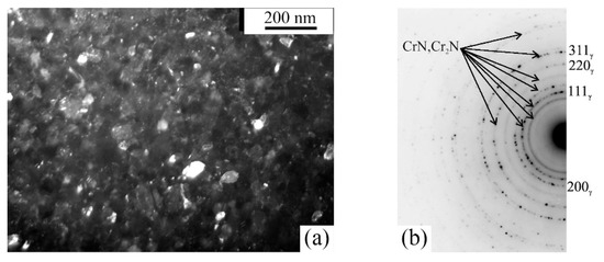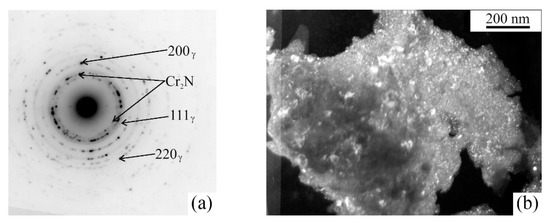 After termination of the annealing at 800 °C for 1 h, an SMC structure of the powder mixture remained unaltered, see Figure 7. The phase composition of the powder mixture Fe–8.6Cr + 15Mn2N presents by itself—after the milling and annealing—the austenite and chromium nitrides (CrN and Cr2N). Annealing of the MA samples leads both to an increase in the size of chromium nitrides, which have been formed in the course of mechanical alloying, and to their precipitation at the dissolution of supersaturated γ solid solution. In the SAED pattern shown in Figure 7a, one can see two first reflection rings that correspond to nitrides of chromium (CrN and Cr2N). In the dark-field image taken in the reflection «CrN + Cr2N», (Figure 7b), it is these nitrides that shine.