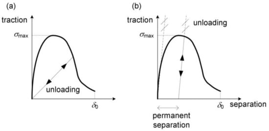 The unloading model is included in the traction–separation law. There are two different approaches. In the first one, regardless of the applied load, after unloading, the material returns to its initial state, in which both traction and separation are equal to 0 (Figure 5a). This type of approach describes brittle failure, in which microcracks are able to fully close after complete unloading.