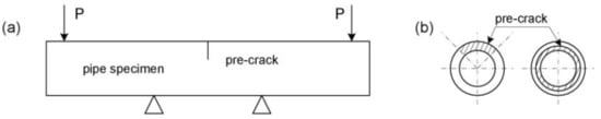 (a) Four-point bending test of a pipe; (b) geometry of initially introduced cracks, data from [56].