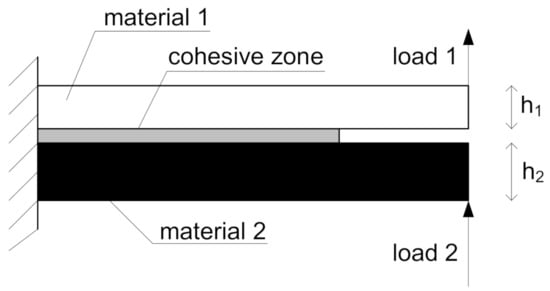 A study on the practical application of the cohesive model and methods of determining its parameters under mixed-mode loading was presented by Wu et al. [59]. The authors performed a numerical analysis of a double-cantilever beam, shown schematically in Figure 10. The individual elements of the beam were made of different materials, connected along the contact surface using the cohesive model and loaded in different ways at the ends, which resulted in the formation of a complex stress state in the cohesive area.