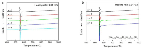 The differential scanning calorimetry (DSC) patterns of (a) [Co0.075Fe0.675B0.2Si0.05]100−xCrx (x = 0–4) as-spun ribbons, and (b) [Co0.075Fe0.675B0.2Si0.05]100−xCrx (x = 5–8) as-spun ribbons.