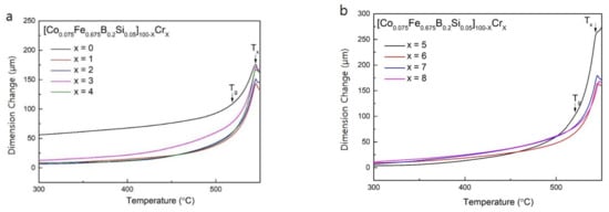 Temperature dependence of the dimension change for (a) [Co0.075Fe0.675B0.2Si0.05]100−xCrx (x = 0–4) as-spun ribbons, and (b) [Co0.075Fe0.675B0.2Si0.05]100−xCrx (x = 5–8) as-spun ribbons.