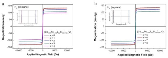 Hysteresis M-H loop of (a) the as-spun [Co0.075Fe0.675B0.2Si0.05]100−xCrx (x = 0–4), and (b) the as-spun [Co0.075Fe0.675B0.2Si0.05]100−xCrx (x = 5–8).