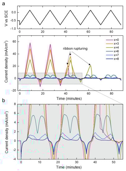 To understand the effect of Cr addition on corrosion behavior, we recorded cyclic voltammograms of the alloys in an acidic 0.1 M HCl solution. As shown in Figure 5, the degree of Cr addition significantly altered the current responses of the alloy specimens. Overall, the average current density became lower as the Cr contents increased, confirming that the addition of Cr improved the corrosion resistance of the alloys. For the alloys with x < 6, the current density continuously increased until the potential reached 0.15 V cutoff condition during the anodic scan and then decreased during the cathodic scan. We noted the ruptures of ribbons with a low Cr content (x = 0, 3, and 4) occurring in the middle of the cyclic voltammetry (CV) measurements (indicated with arrows). The disconnection of the ribbons as the result of severe corrosion caused a sudden current drop. In sharp contrast, the alloys with x = 6, 7, and 8 exhibited reproducible current responses for five CV cycles without suffering from the failure, enduring for a longer duration. The result confirms the positive effect of Cr doping on anti-corrosion properties. For the Cr-rich alloys, the current densities did not continuously increase during the anodic scan. Instead, there was a decay after the initial increase in current density, as displayed in Figure 4b. We attributed the origin of the decrease in current density to the formation of the passivation layer on the surface of the high-Cr alloys during the anodic scan, which suppressed further proceeding of corrosion at a high potential [24].