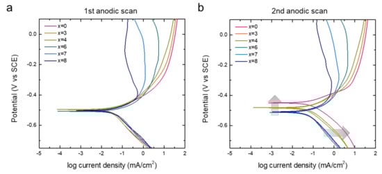 Polarization diagrams of [Co0.075Fe0.675B0.2Si0.05]100−xCrx (x = 0, 3, 4, 6, 7, 8) measured in Figure 5. Panels (a,b) show the diagrams for first and second anodic scans, respectively.