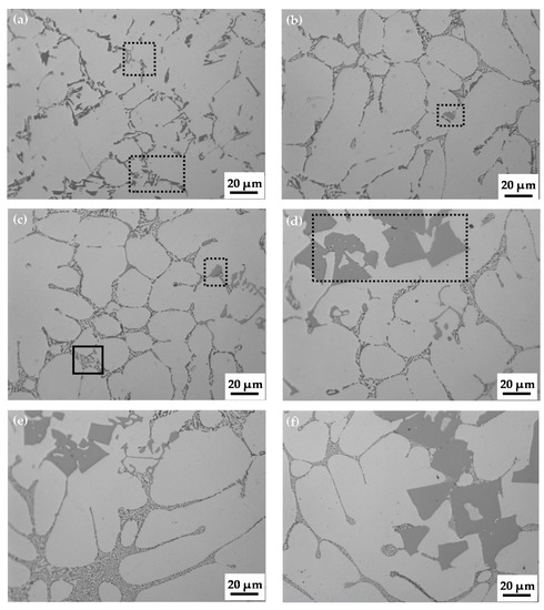 The as-cast microstructures of Al-5Si-0.8Mg free of Mn and Al-5Si-0.8Mg-(0.45–1.97)Mn (mass fraction, %) alloy ingots are shown in Figure 2. The figure shows there are many white α-Al dendrites and many needle-like and flake-like gray or dark-gray phases, which are all distributed along the grain boundaries or interdendritically (Figure 2a, dashed rectangular area) in the Mn-free Al-5Si-0.8Mg alloy ingot. With the addition of Mn, the number of light needle-like or blocky alloy phases in the alloy increases (Figure 2b,c, dashed rectangular area). Moreover, the eutectic microstructure of the alloy ingots is slightly refined. When the content of Mn reaches 0.72%, light-gray skeletal phases (size: approximately 20 μm) appear in the alloy ingots (Figure 2c, dashed rectangular area). When the Mn content reaches 1.09%, blocky alloy phases (size: approximately 50 μm) appear in the ingot (Figure 2d, dashed rectangular area), and the eutectic lamellar structure of the alloy ingot is further refined. Finally, as the Mn content increased from 1.09% to 1.97%, the number of blocky alloy phases increased, but the eutectic lamellar structure did not change significantly.