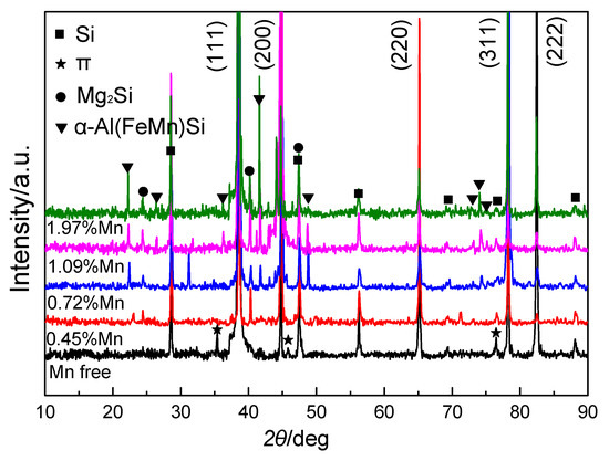 Figure 3 shows the X-ray diffraction (XRD) patterns of Al-5Si-0.8Mg ingots free of Mn and those with 0.45% Mn, 0.72% Mn, 1.09% Mn, and 1.97% Mn. The figure shows that there are mainly four types of alloy phases existing in Al-5Si-0.8Mg ingots without Mn: α-Al, Si phase, π phases (Al8Mg3FeSi6) and Mg2Si phases. The structure of π (Al8Mg3FeSi6) is hexagonal P-62m space group with the lattice parameter of a as 0.66 nm and c as 0.79 nm. When Mn was added to the Al-5Si-0.8Mg alloys, the intensity of the diffraction peak of the π phase (Al8Mg3FeSi6) weakened and nearly disappeared. Moreover, diffraction peaks of the α-Al(FeMn)Si phases appeared in the XRD patterns of the alloy ingots. With the further increase in Mn contents, the number of diffraction peaks of the α-Al(FeMn)Si phases increased, and the intensity of those peaks increased. The intensity of the Mg2Si phase diffraction peaks also increased with increasing Mn. According to the above results, there are mainly α-Al, Si phases, α-Al(FeMn)Si phases and Mg2Si phases existing in Mn-containing Al-5Si-0.8Mg alloy ingots. The structure of the α-Al(FeMn)Si phase is bcc with Im 3 space group with the lattice parameter of a as 1.25 nm.