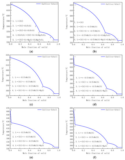 Calculated Solidification curves of Al-5Si-0.8Mg-xMn alloys under Gulliver–Scheil non-equilibrium conditions: (a) without Mn and with (b) 0.45% Mn, (c) 0.72% Mn, (d) 1.09% Mn, (e) 1.65% Mn and (f) 1.97% Mn.