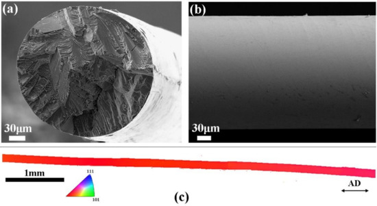 Ni50Mn34Fe3In13 (at. %) polycrystalline button ingots were prepared by arc melting the pure Ni, Mn, Fe, and In elements. The ingots were melted four times in order to ensure homogeneity. The Taylor–Ulitovsky method [20,21] was used to prepare the glass-coated microwires with a diameter of 50−150 μm. After removing the glass sheath, the microwires were tested without any post heat treatments. The cross-section and surface morphologies of the microwire were investigated using a scanning electron microscope (SEM, Carl Zeiss, Oberkochen, Germany). The crystallographic orientation was studied using electron backscatter diffraction (EBSD, Carl Zeiss, Oberkochen, Germany), which was conducted at room temperature in the SEM. Synchrotron high-energy X-ray diffraction (HEXRD) experiments were conducted using a monochromatic X-ray beam with a wavelength of 0.1173 Å at the 11-ID-C beam line of the Advanced Photon Source at the Argonne National Laboratory, USA.