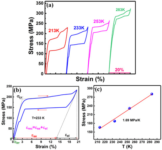 (a) Tensile stress–strain curves recorded at different constant temperatures in the range of 213–283 K for the Ni50Mn34Fe3In13 microwire. (b) Tensile stress–strain curve measured at 233 K with the determination of the following parameters: the critical stress for stress-induced martensitic transformation σcr, the stress hysteresis of the stress-induced martensitic transformation ∆σ, the irrecoverable strain after unloading εirr, the superelastic strain εse and the elastic strain εel. The total recoverable strain εrec is the sum of εse and εel. (c) Temperature dependence of the critical stress for stress-induced martensitic transformation σcr.