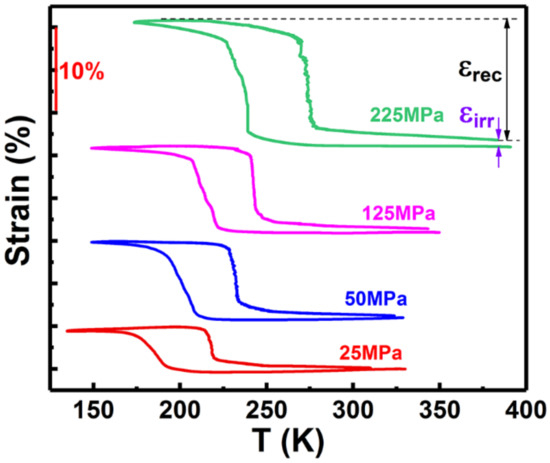 The shape memory effect was examined by load-biased thermal cycling tests under different constant stresses. The strain–temperature curves recorded under stress levels of 25, 75, 125 and 225 MPa for the Ni50Mn34Fe3In13 microwire are shown in Figure 4. The recoverable strain εrec and irrecoverable strain εirr were determined and are illustrated in the figure. As can be seen, the strain associated with martensitic transformation was completely recovered after the cooling–heating cycle when the applied stresses were not higher than 75 MPa. The recoverable strains were high; they were 5.0% under 25 MPa and 8.9% under 75 MPa. The irrecoverable strain εirr occurred when the stress increased to above 125 MPa. In spite of this, εrec continued to increase as the stress increased, and amounted to 9.5% under 125 MPa. Strikingly, when the stress increased to 225 MPa, a εrec as high as 13.9% was achieved. This is the highest shape memory strain that has been reported to date in Ni-Mn-based SMAs, which is of great importance to realizing a large stroke in actuator applications [2,29].