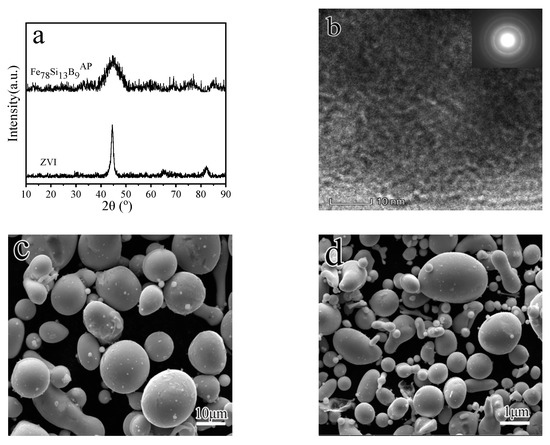 XRD spectra and SEM of the iron-based materials: (a) The XRD patterns; (b) the TEM image of Fe78Si9B13AP; (c) the surface morphology of Fe78Si9B13AP; (d) the surface morphology of zero valent iron (ZVI).