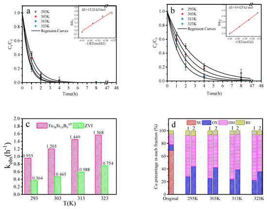 Figure 2a,b shows the exponential decay curve of the normalized concentration of Cu2+ reacting with Fe78Si9B13AP and ZVI at different temperatures. The reaction of each experimental group basically ended within 10 h, and there is no secondary dissolution after 10 h, indicating that the reduction products could stably exist in the reaction system. Figure 2c shows the kobs obtained by fitting the quasi-first-order kinetic equation (Equation (1)). With the increase of the reaction temperature from 293 to 323 K, the kobs of each experimental group shows an upward trend. The kobs of Fe78Si9B13AP increases from 0.955 to 1.568 h−1. The kobs of ZVI is significantly lower than that of Fe78Si9B13AP. Generally speaking, the smaller the particle size and the higher the content of the reactant, the more conducive it is to speeding up the reaction [35,36]. However, in this experiment, the kobs of ZVI with a relatively small particle size and higher iron content reacting with Cu2+ are lower than Fe78Si9B13AP with a relatively large particle size and lower iron content, which may be due to the metastable state of MGs caused by the structure.