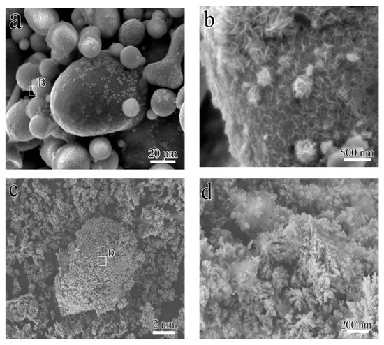 Morphology of the products after the reaction of three materials with Cu2+ ions: (a) Fe78Si9B13AP; (b) high resolution image of regional (B); (c) ZVI; (d) high resolution image of regional (D).