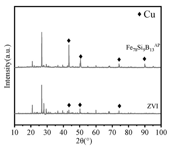 According to the previous kinetic analysis, it is known that the reduction of Cu2+ ions by Fe78Si9B13AP and ZVI is controlled by the diffusion process. Therefore, the morphology and phase of the surface products directly affect the movement of Cu2+ ions to the reaction interface. The morphology and phase composition of the surface products before and after the reaction are analyzed by SEM and XRD. Figure 3a shows the morphology of the product on the surface of Fe78Si9B13AP. The originally smooth surface is seriously corroded and the product layer on the surface is thin. In order to observe the morphology of the product more clearly, the B region is magnified and displayed in Figure 3b. The product layer presents a three-dimensional flower-like structure composed of nano-lamellar intercalation perpendicular to the reaction interface, and the interstitial pores provide a channel for the diffusion of Cu2+ ions to the reaction interface. Figure 3c observed that ZVI is completely surrounded by a dense product layer. Some of the products fall off from the matrix, which is difficult to extract in the later magnetic separation process. Figure 3d shows a high-resolution image of the product layer overlaid on the ZVI. The morphology of the product is dendritic and grows randomly in all directions, which hinders the contact between Cu2+ ions and ZVI, which is the main reason for the low activity of ZVI. With regard to the explanation that the morphology of the products of amorphous and crystalline alloys affects the reaction rate, some scholars think that there is an active “liquid-like” layer on the surface of the amorphous alloy [42]. Figure 4 shows a Bragg peak of Cu0 in the XRD pattern of soil treated with Fe78Si9B13AP and ZVI. The products of Cu2+ ions reduction by two kinds of iron-based alloys are Cu0. Since the standard electrode potential of copper E(Cu/Cu2+) is higher than the standard electrode potential of hydrogen E(H2/H+), even long-term acid rain leaching cannot dissolve Cu0 again, effectively reducing the potential risk of copper in the soil.